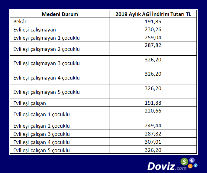 2019 yılına ait asgari geçim indirimleri aşağıdaki gibidir: