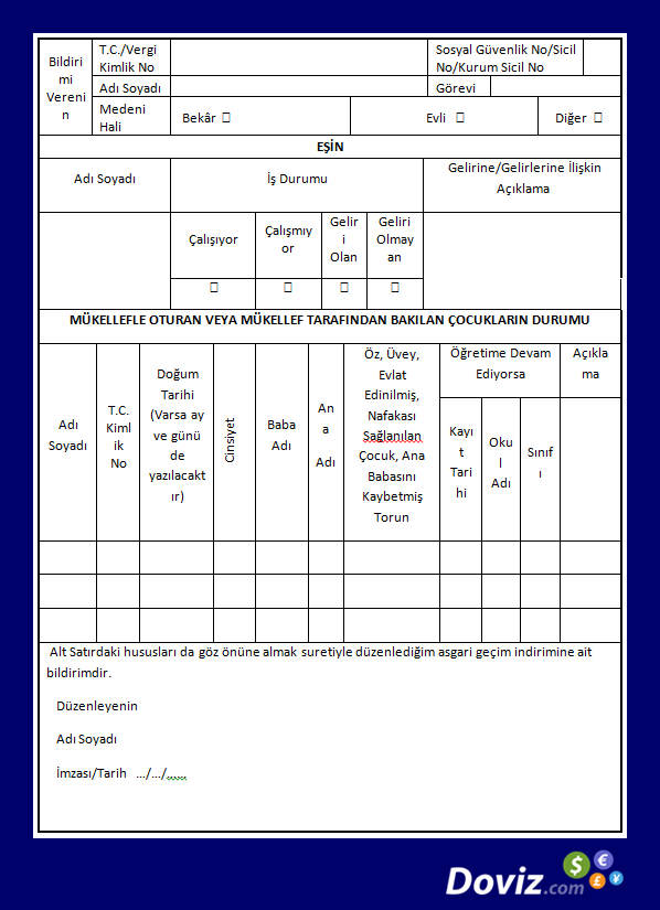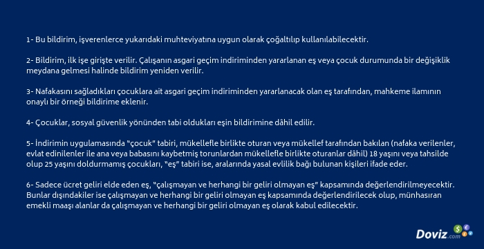 Çalışanlar tarafından doldurulan ve aşağıda yer yer alan Aile Durum Bildirim Formu’nda beyan edilen bilgiler esas alınarak her çalışanın hak kazandığı asgari geçim indirimi tutarı hesaplanır. Çalışanlar durumlarında herhangi bir değişiklik olması halinde (evlenme, boşanma, doğum vb.) bu değişiklikleri işverene bir ay içerisinde bildirmekle yükümlüdürler. Söz konusu değişiklikler, işverene bildirildiği tarih itibariyle uygulanır. Çalışanın beyanına göre ilgili yıl geçerli olan tutarlar üzerinden hak ettiği asgari geçim indirimi hesaplanır. Çalışanın hakettiği asgari geçim indirimi tutarı çalışanın her çalıştığı gün sayısı üzerinden hesaplanır. Ücretsiz izin günleri hesaba dâhil edilmez. Asgari Geçim İndirim hesabına dâhil edilen çocuk sayısı tavanı evli ve eşi çalışmayan ücretliler için 3 çocuk, eşi çalışan ücretliler için ise 5 çocuk olarak belirlenmiştir.
