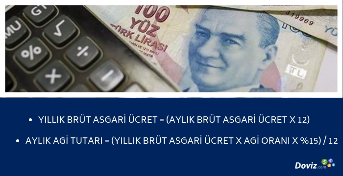 Aylık brüt asgari ücret 12 ile çapılarak yıllık asgari ücret bulunur ve yıllık asgari ücret toplamı çalışana uygulanacak AGİ oranıyla ve ilk vergi dilimi olan %15 ile çapılır ve çıkan sonuç 12 ye bölünerek aylık AGİ tutarı bulunur.