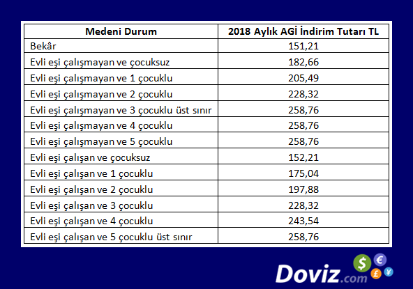 2018 yılı için belirlenen brüt asgari ücret olan 2.029,50 TL üzerinden hesaplanan asgari geçim indirimi tutarları ise aşağıdaki tabloda gösterilmiştir.
