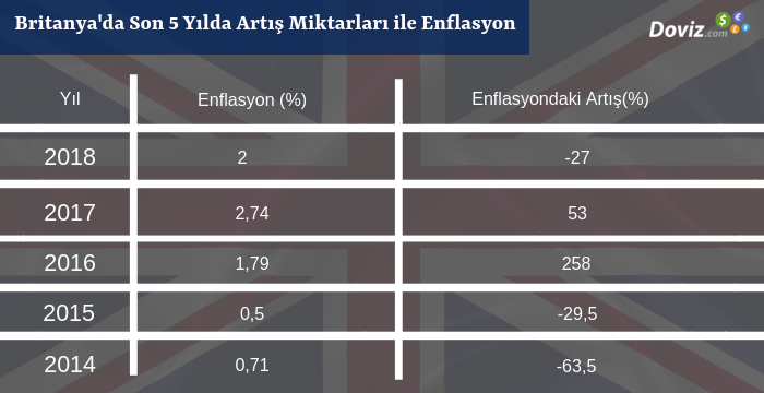 İngiliz ekonomisi Sterlinin gücünden de kaynaklı olarak 2009 yılındaki morta krizi haricinde 90’ların başında beri yüzde 5 altında enflasyon ile idame ediliyor. Hatta aşağıdaki tablodan da görülebilineceği üzere 2015 yılında 0.50 ile son 50 yılın en düşük seviyesini test etmişti. Lakin, Brexit kararının ardından enflasyondaki artış yüzde 200 dolaylarına çıktı. 2017 yılında yenilenen seçimin ardından Muhafazakâr Parti May ile güvenoyu alması her ne kadar dezenflasyona yol açsa da halen enflasyon miktarı alışagelmişin dışında.