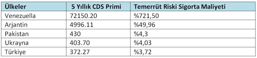 Yukarıdaki tabloda görüldüğü gibi büyük bir ekonomik kriz yaşamakta olan Venezuella 72.150,20 lik CDS primi ile ilk sırada yer alırken, Türkiye CDS primi en yüksek ülkeler arasında beşinci sırada yer alıyor. Venezualla’nın temerrüde düşme olasılığı %100 , Türkiye’nin temmerüde düşme beklentisi ise %6,10 olarak hesaplanıyor.