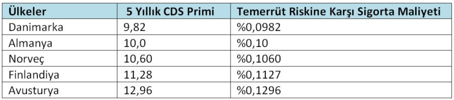 Yukarıdaki tabloda görüldüğü gibi Danimarka 9,82 ile CDS primi en düşük ülkeler arasında birinci sırada Almanya ise 10 ile ikinci sırada yer alıyor. Verilerden de anlaşılabildiği gibi ekonomik , finansal ve siyasi istikrar CDS primininin seviyesini belirleyen en önemli unsurlar.