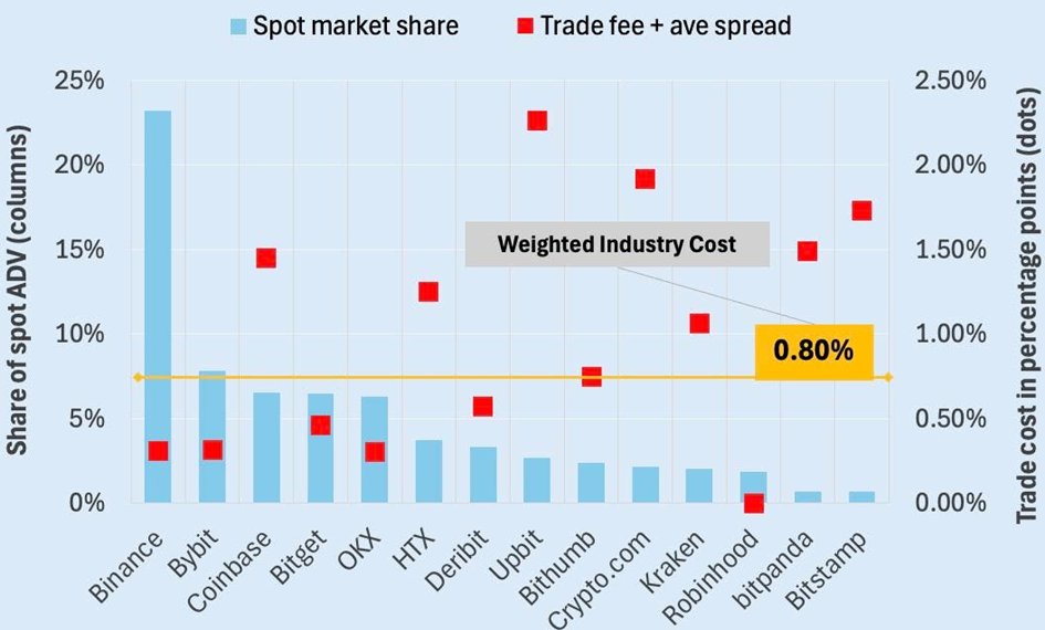 Yapılan araştırmada, herhangi bir hacim indirimi ya da promosyon olmaksızın 25.000 dolarlık bir kripto alımının maliyeti incelenmiş ve kripto borsalarında ortalama toplam işlem maliyeti (spread dahil) 80 baz puan (bp) olarak hesaplanmıştır.